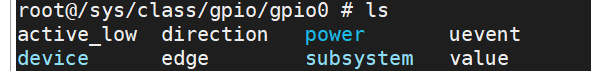 导出成功之后会发现在/sys/class/gpio 目录下生成了一个名为 gpio0 的文件夹(gpioX, X 表示对应的编号),如上图所示。这个文件夹就是导出来的 GPIO 引脚对应的文件夹,用于管理、控制该 GPIO 引脚 。