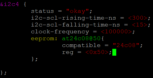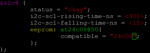 如上图,通过设备树告诉内核,I2C4开始使用,并且挂载了一个EEPROM设备,名字叫at24c08@50,其使用的驱动是compatible=“”;