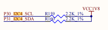 模块自带I2C4上拉电阻,因为OK3399-C底板上也带有上拉电阻如下图,并且是1.8V上拉,为了电平匹配,不修改底板的状态下,使用1.8V为基准,将模块带有的上拉电阻摘除,使用1.8V配置。