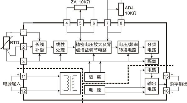 模块内部集成了高效率的DC-DC,能产生两组互相隔离的电源分别给内部输入端热电阻长线补偿电路、线性化处理电路、电压放大调整电路、精密电压频率转换电路、分频电路、隔离抗干扰抑制电路供电和输出端输出电路供电。特别适用于将热电阻信号隔离转换成数字脉冲频率信号,温度信号的变送与无失真远传,工业现场PLC或DCS系统的温度信号采集与隔离。内部采用的SMD工艺结构及新技术隔离措施使该器件能达到:工作电源/信号输入/输出 3000VDC三隔离,并且能满足工业级宽温度、潮湿、震动的现场恶劣工作环境要求。