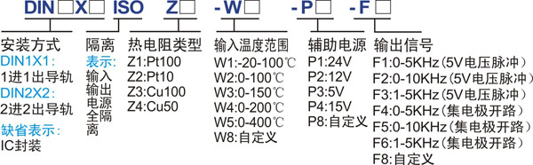 例5: 输入:Pt100,温度范围 0-150℃; 输出:0-5KHz(集电极开路);辅助电源:24V。二进二出导轨式。