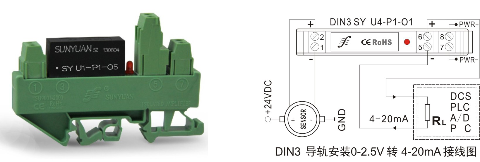 概述:DIN3 SY U-P-O / SY A-P-O 系列小体积、低成本、高精度、标准DIN35导轨安装的 SY U-P-O 系列直流电压信号与 SY A-P-O 系列直流电流信号两隔离(工作电源与信号通道地线隔离)放大器,采用导轨安装低成本小体积设计方案,主要用来解决传感器与仪器仪表、PLC、DCS 之间:0.4-2V/0-5V/1-5V/0-10V/0-20mA/4-20mA 等非标准模拟量与标准模拟信号的转换问题。产品具有高精度和高线性度特点,工作电源与信号通道间 3000VDC 隔离电压,可抑制供电系统中浪涌和共模谐波干扰。这款两隔离放大器使用方便、免零点和增益调节,无需外接调节电位器等元件,适用于模拟电压与电流信号间的转换放大且输入与输出无需隔离的场合。与顺源其它 ISO系列隔离放大器产品相比,具有体积小、成本低、频响高及更好的精度和线性度。