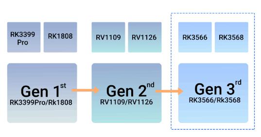 RKNPU经过了几代的发展,首代初次引入了RKNPU是从RK3399pro和RK1808开始的,相比传统的CPU和GPU,在深度学习运算能力上有比较大幅度的提升。接下来在RV1109和RV1126上使用了第二代NPU,提升了NPU的利用率。第三代NPU应用在RK3566和RK3568上,搭载全新NPU自研架构。