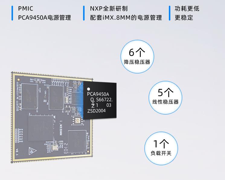 采用PCA9450A电源管理,是NXP全新研制配套iMX.8M的电源管理芯片,有六个降压稳压器、五个线性稳压器和一个负载开关,为整个系统的稳定运行提供了更可靠的保证。