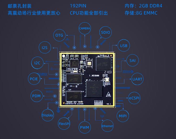 i.MX8MM处理器采用了先进的14LPC FinFET工艺,提供更快的速度和更高的电源效率;四核Cortex-A53,单核Cortex-M4,多达五个内核 ,主频高达1.8GHz,2G DDR4内存、8G EMMC存储。