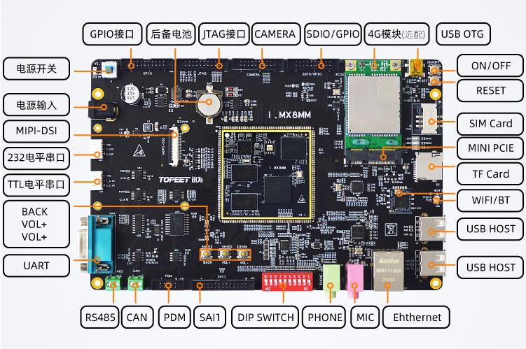 千兆工业级以太网、MIPI-DSI、CAMERA、USB HOST、WIFI/BT、4G模块、CAN、RS485等一应俱全。