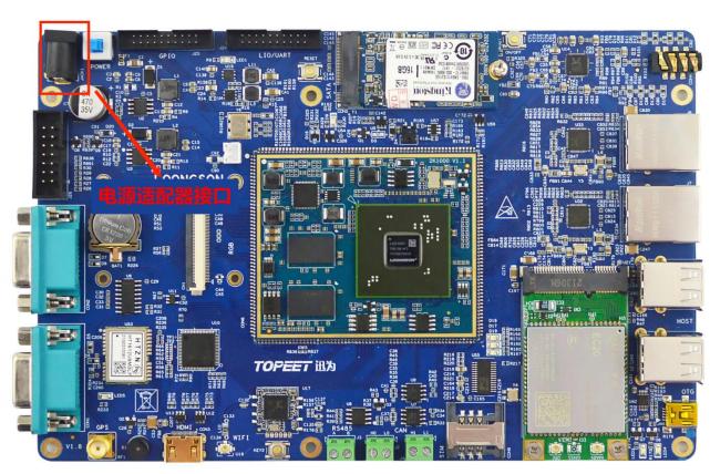 我们使用配带的电源适配器,开发板为 12V 供电,连接电源适配器到开发板的电源接口,电源适配器接口如下图所示: