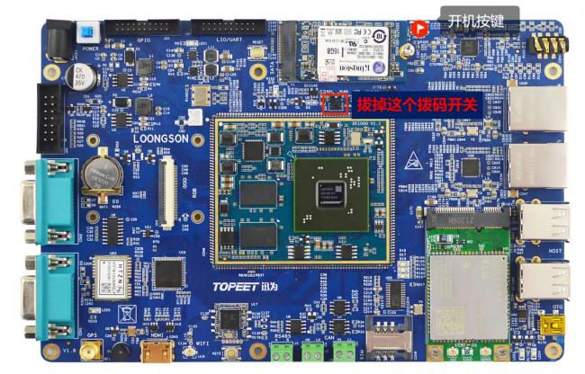 龙芯开发板的启动方式有两种,一种是上电直接启动,一种是上电通过按键启动。开发板默认为上电