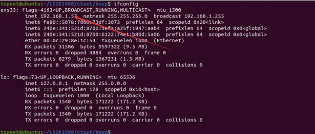 安装好 iperf3 测试工具以后,我们以 Ubuntu 为服务器,开发板为客户端进行测试,我们先使用命令 ifconfig 看下 Ubuntu 的 ip,如下图所示: