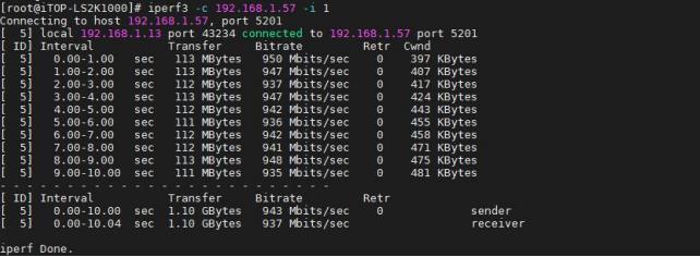 最后开发板作为客户端使用命令 iperf3 -c 192.168.1.57 -i 1 连接 Ubuntu 服务端,