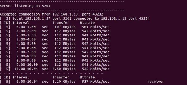 从上图可以看出,Ubuntu 的 ip 地址为 192.168.1.57,大家根据自己的实际情况为准,接着输入命令 iperf3 -s 启动 Ubuntu 的服务端,