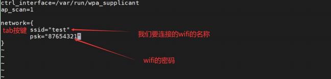 使用命令 vi /etc/wpa_supplicant.conf 打开配置文件配置 wifi 的账号和密码。如下图所示