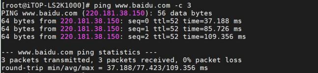 www.baidu.com -c 3 命令来测试一下网络是否正常使用, 命令如下所示