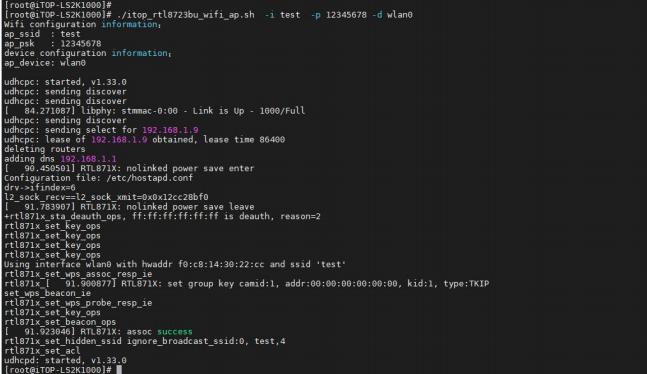 输入命令./itop_rtl8723bu_wifi_ap.sh -i test -p 12345678 -d wlan0,其中,test 为我们创建的热点的名