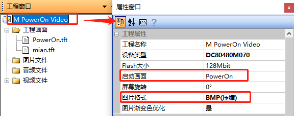 双击工程名称,显示工程属性窗口,将启动画面选择为开机视频画面、图片格式默认为BMP(压缩),如图5-3所示。