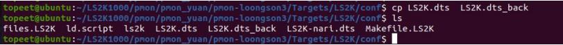 我就进到 pmon 源码的 pmon-loongson3/Targets/LS2K/conf 路径下,使用命令 cp LS2K.dts LS2K.dts_back 备份一下设备树文件,如下图所示: