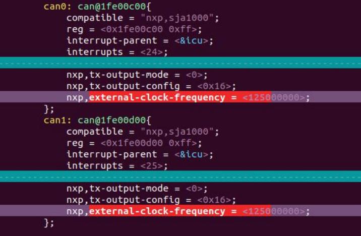 接着我们使用命令 vim LS2K.dts 打开设备树文件,找到 can0 和 can1 的设备节点,可以发现,在 BSP 里 面已经默认配置好了,不需要我们在额外配置,如下图所示:
