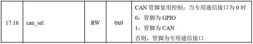 接着我们来配置引脚的复用关系,通过 LS2K1000 的数据手册,可知地址 0x1fe10420 的第 16 到 17 位配置的是 can 引脚的复用关系,如下图所示: