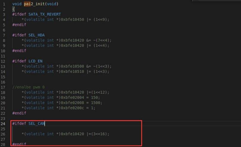 通过上表可知,如果我们要把 GPIO 设置为 CAN 功能,我们需要将 16 到 17 位设置为 1,我们可以直接在 pmon 里面操作这个寄存器,比如使用在 Targets/LS2K/ls2k/tgt_machdep.c 文件中增加代码(volatile int *)0xbfe10420 |=(2<<16)将这俩位设置为 1,但是在 pmon 的 bsp 里面这些工作已经给我们做好了,只不过是没有编译进去而已。