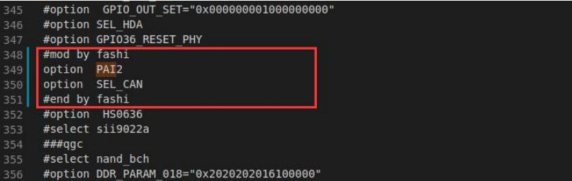 所以我们是不是就不用在自己单独来添加代码了呢,我们只需要加上这 PAI2 和 SEL_CAN 这来个宏定义即可,我们打开 Targets/LS2K/conf/ls2k 文件,取消注释 option PAI2 并增加宏定义 option SEL_CAN,如下图所示: