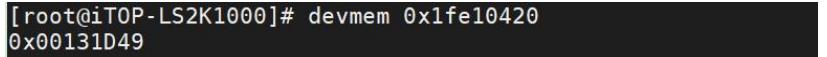 然后我们重新编译 pmon 源码并烧写到开发板上,使用命令 devmem 0x1fe10420 来查看有没有成功将这俩个管脚的复用设置成 can,如下所示: