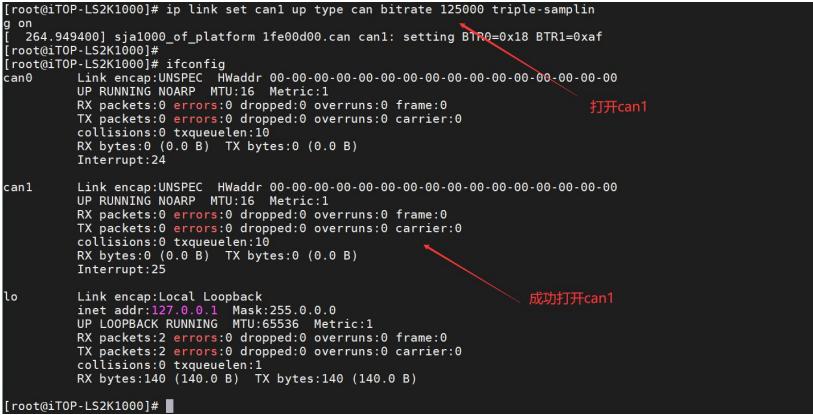 开发板上的两路 CAN 默认是关闭的, 我们在调试串口终端输入“ip link set can0 up type can bitrate