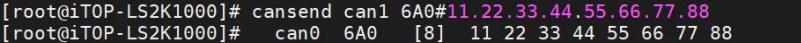 然 后 我 们 使 用 CAN1 作 为 数 据 发 送 端 , 我 们 在 调 试 串 口 终 端 输 入 “cansend can1 6A0#11.22.33.44.55.66.77.88”命令, 发送数据, 其中的 6A0 是帧 ID, #后面的是数据, 共 8 个字节。 运行结果如下图所示: