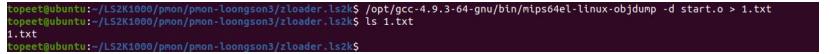 然后我们重新编译 pmon 源码生成 pmon 镜像并烧写到开发板,一定要将编译的烧写到开发板!!!接着在 pmon-loongson3/zloader.ls2k 使用命令/opt/gcc-4.9.3-64-gnu/bin/mips64el-linux-objdump -d start.o > 1.txt