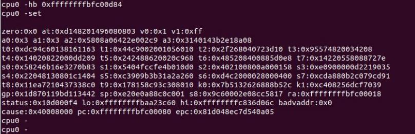 接着我们启动 Ejitag 工具并配置好 Ejtag 工具,在 Ejtag 命令行下输入命令 hb 0xffffffffbfc00d84,注意,此