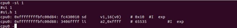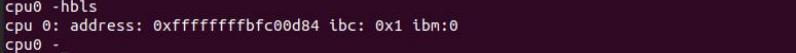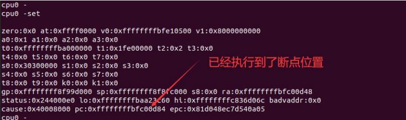 然后执行 cont 命令运行 cpu,cpu 会执行到这个断点位置,然后停止,如下图所示: