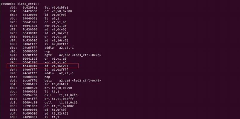 从上图可以看出,控制 led3 相关的代码是从地址 d60 开始的,而 MIPS 的入口地址是 0xbfc00000,所以我们是不是就可以把断点打的地址为 0xbfc00d84 的地方呢,这个地方对应的指令为点灯操作。