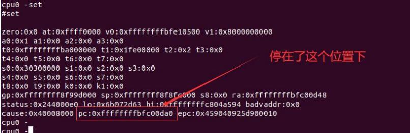 接着我们给开发板上电,此时 hb 命令会执行成,这时立刻输入 set 命令停止 cpu,如下图所示: