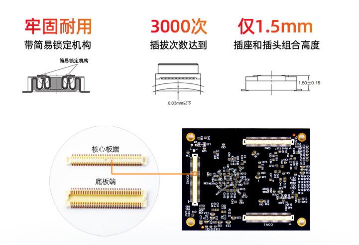 核心板通过了电磁兼容,电磁辐射,安规检测、高低温环境测验,采用邮票孔的连接方式,连接方式更加稳定和可靠。