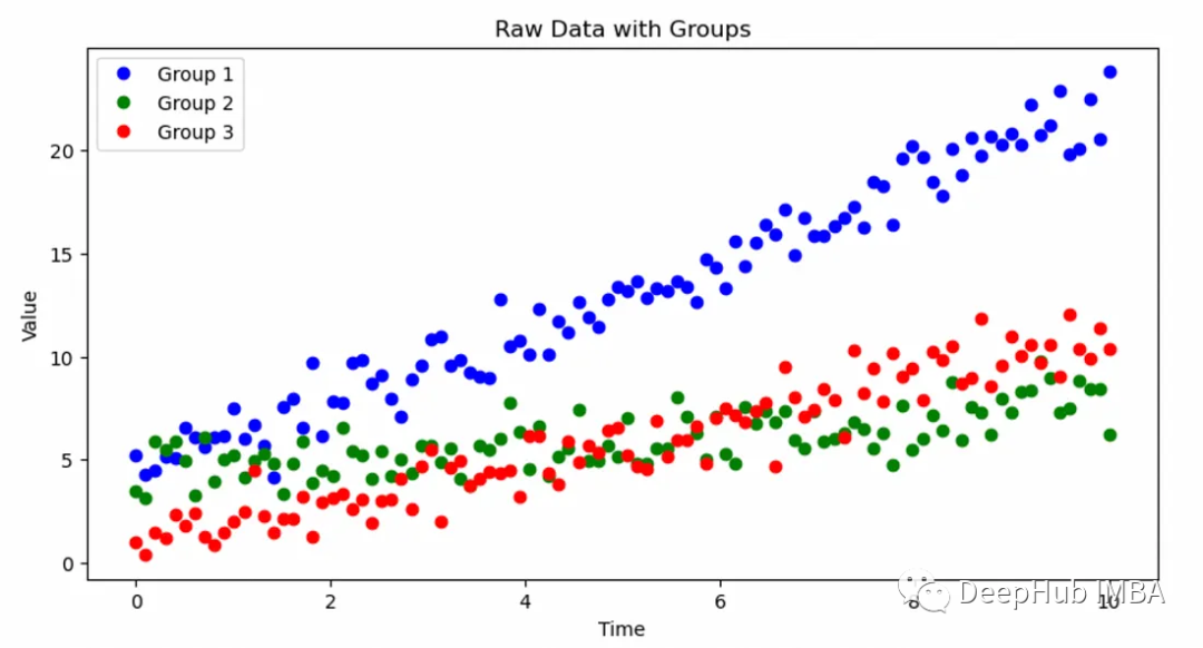 我们生成了三个不同组的时间序列数据。每组都有自己的时间趋势,由唯一的截距和斜率定义。