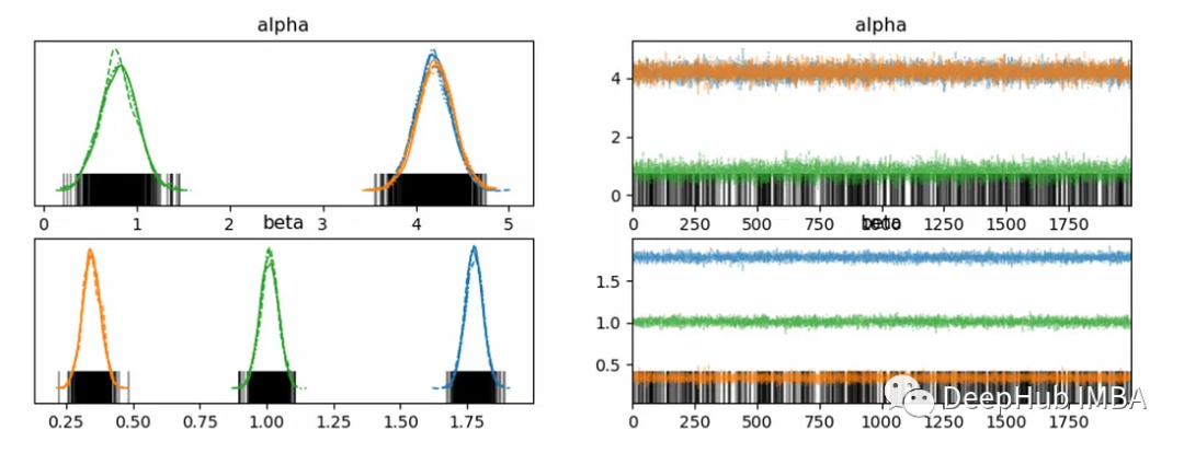 现在我们已经定义了模型并对其进行了采样。让我们检查不同参数的模型估计: