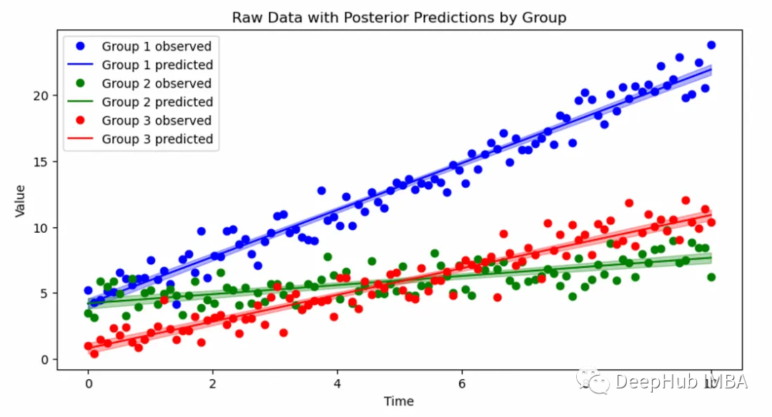 从图中可以看出,分层时间序列模型很好地捕获了每组中的单个趋势,而阴影区域给出了预测的不确定性。