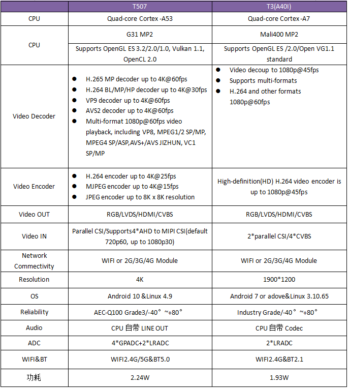 全志T3四核车载导航处理器,Cortex-A7架构,主频1.2GHz,集成MAli400MP2 GPU,支持内存DDR3L/LPDDR3,存储可接口eMMC。工业级运行温宽,支持绝大部分当前流行的视频及图片格式解码,具有稳定可靠的工业级产品性能、低功耗、以及丰富的用户接口等优势,搭载Linux和Android操作系统,适用于车载电子、电力行业、医疗电子、工业控制、物联网、智能终端等领域。
