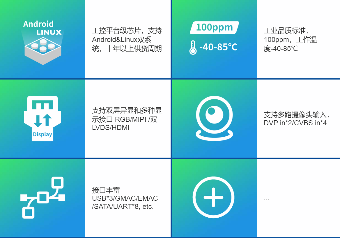 核心板基于全志科技T3/A40I处理器设计,四核Cortex-A7架构,每核主频高达1.2GHz。核心板采用100%国产元器件方案,并按照工业级(-40~85℃)标准进行高低温测试验证,满足各种工业应用环境。