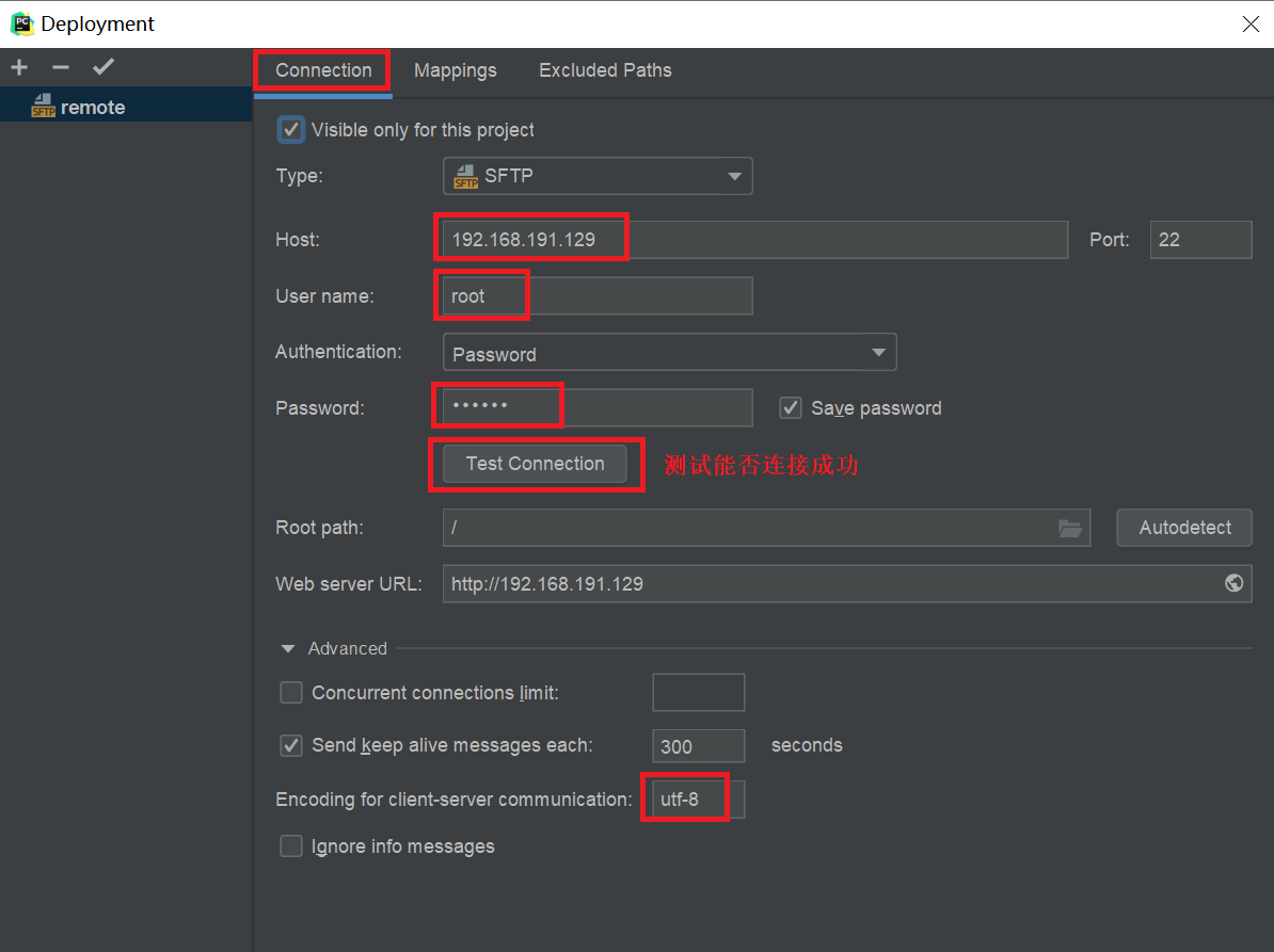 选择Connection栏,填入服务器的IP、帐号、密码,并点击“Test Connection”测试是否可以链接。将编码类型改为“utf-8”: