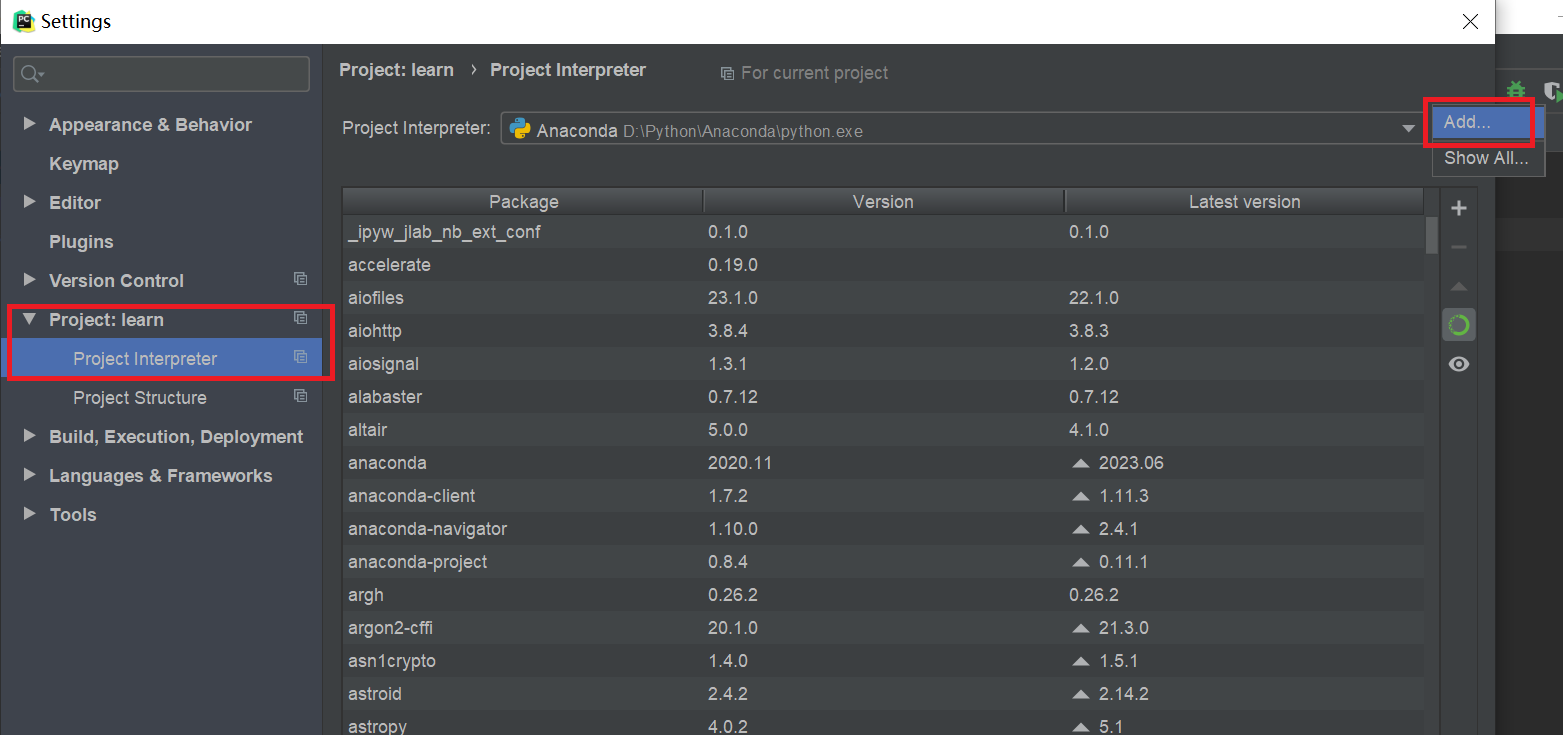 在Pycharm中选择File -> Settings -> Project:learn -> Project Interpreter -> Add
