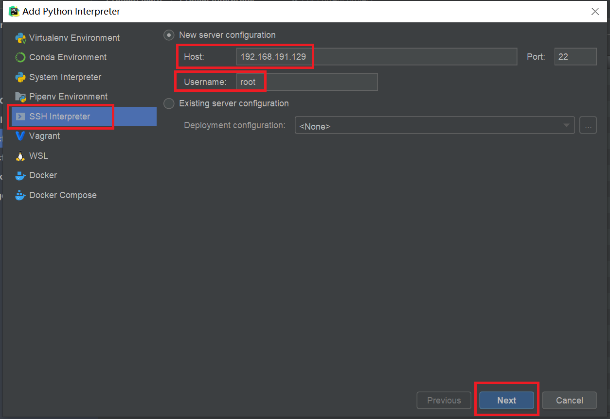 选择SSH解释器,输入服务器的IP、帐号,点击Next,然后输入密码: