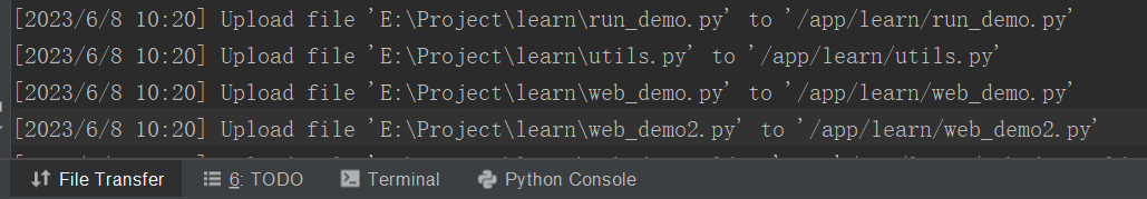 然后点击确定即可。此时Pycharm底部会出现File Transfer栏,显示代码文件的同步信息: