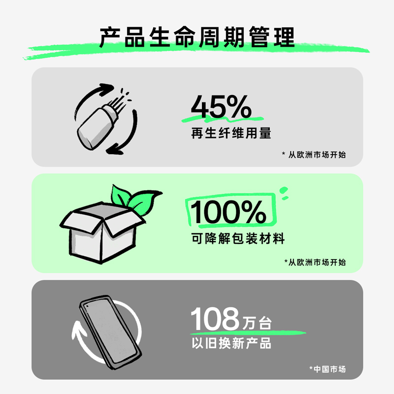 2022年,从欧洲市场起步,OPPO通过使用100%的可生物降解材料和45%的可再生纤维,将绿色理念融入手机产品包装。同时,电子废弃物的回收也一直是OPPO产品生命周期管理的重要组成部分。OPPO建立了产品回收体系,在国内外市场开展以旧换新业务,推动旧手机的回收和再利用。在欧盟等地区,OPPO加入废弃包装的“绿点”回收体系,与专业的回收公司合作。2022年,OPPO国内市场手机回收量达到108万台,回收产品重量达195吨,有效降低了电子废弃物的排放以及对资源的消耗。
