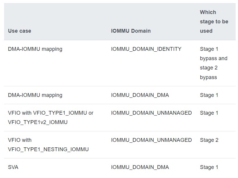 如果SMMUv3硬件只支持stage1或只支持stage2,那么支持的stage可以用于Linux的DMA-IOMMU和VFIO的场景。在Shared Virtual Address (SVA)场景下,必须使用stage1。因而,只支持stage2的SMMUv3 hardware无法使用在SVA场景。