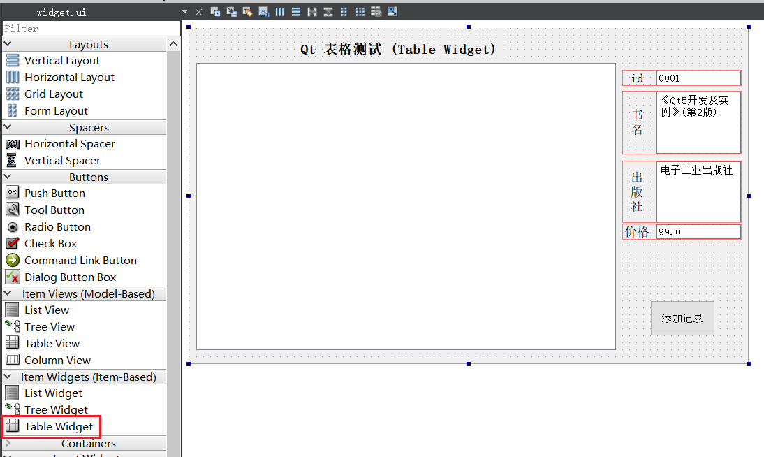 从左侧的ItemWidgets中,拖出一个Table Widget放到界面中,然后设置合适的大小。