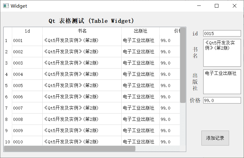 通过一个实例来介绍QTableWidget,下图是表格使用的测试效果。
