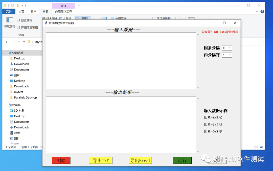 需求点:一个输入框(将参数组合输入进去)、一个输出框(将参数组合分组后打印出来)、分隔符下拉选择项(用于匹配输入的参数分隔符)、操作按钮(运行、导出Excel、导出TXT、删除、关闭)