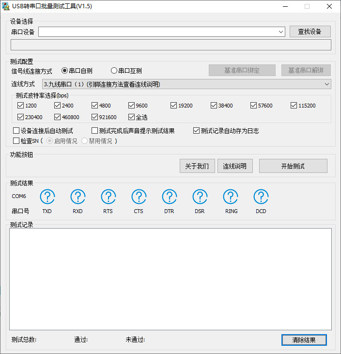 ⑤插入待测串口后,点击“开始测试”按钮进行测试。或者勾选“设备连接后自动测试”部分后,软件开启自动测试;