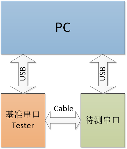 该模式下需要将待测的USB转串口设备与另一个基准USB转串口设备相连接。该基准串口需要支持USB参数配置功能,如CH343P、CH9101U\\H\\R\\Y、CH9102F等型号,使用该工具会自动将其产品字符串配置为“CH34X_Tester”。