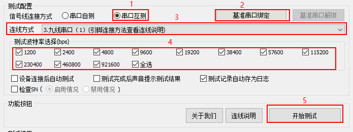 ③选择连线方法后,将待测串口和基准串口按照选择的连线方式进行连线,连线方法可以点击功能按钮区域的“连线说明”按钮进行查看;